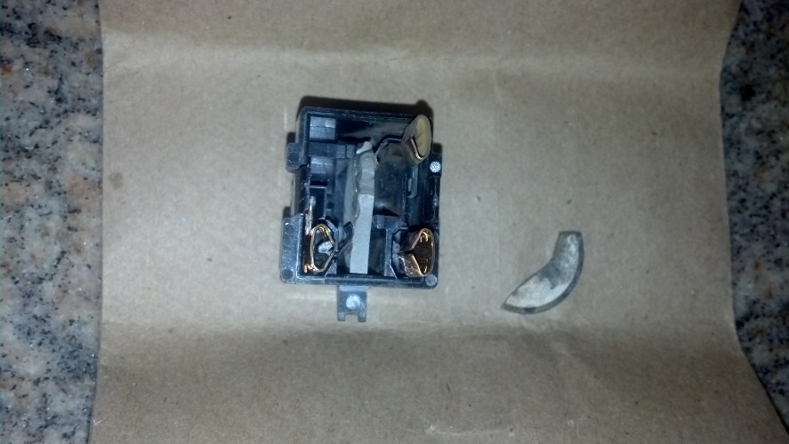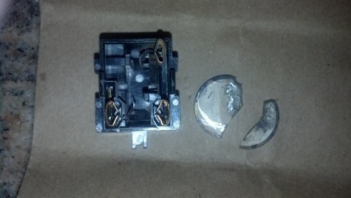 • Using a small screwdriver, remove the case of the relay. Identify the circular ceramic connector inside. Most likely it is broken in two or more pieces. You need that connector to make contact with all of the leads on your relay. My connector was broken in two so I was able to remove the smaller piece and spin the larger piece so that it was in contact with each of the leads on the relay.fridge_click_relay_7